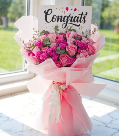 د.إ149.00A stunning bouquet featuring 9 Pink Roses and 3 Pink Spray Roses, beautifully accented with Fresh Green Fillers. Wrapped elegantly in Stylish Paper with a cheerful “Congrats” message, this bouquet is a perfect way to celebrate Special Moments and share in someone’s Happiness.