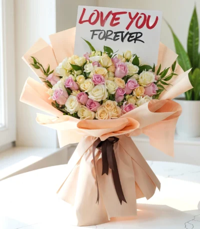 د.إ149.00A breathtaking bouquet featuring 12 Fresh Roses in shades of Pink, Peach, and White, beautifully complemented with Lush Green Fillers. Wrapped in Elegant Paper with a heartfelt “Love You Forever” message, this bouquet is a perfect symbol of Timeless Love and Devotion