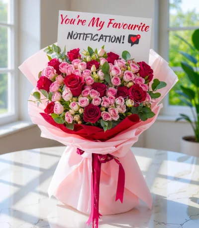 د.إ149.00A romantic bouquet featuring 6 Classic Red Roses and 6 Charming Pink Spray Roses, elegantly complemented with Fresh Green Fillers. Wrapped in special “You Are My Favourite Notification” paper, this bouquet is a sweet and modern way to show your Affection and Admiration.