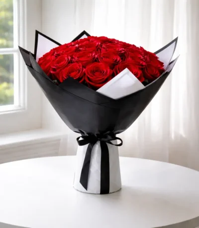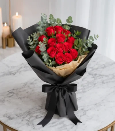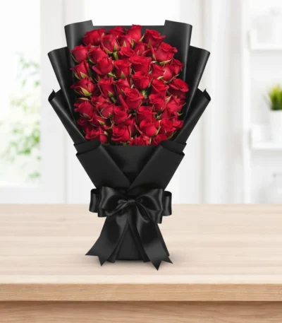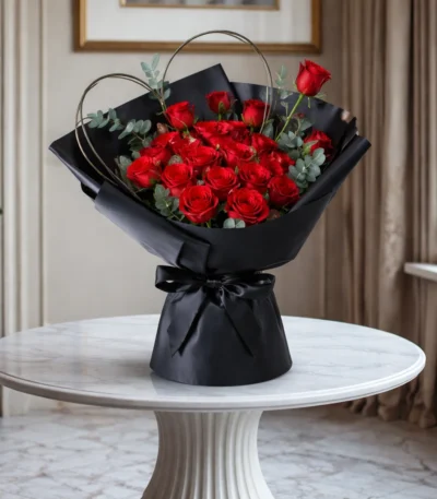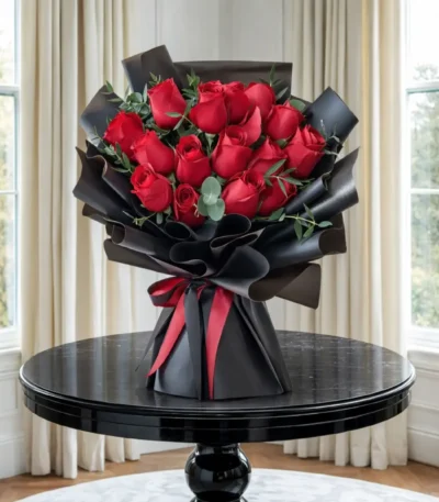 An elegant bouquet of premium red roses wrapped in sleek black packaging, designed to express deep love, passion, and timeless sophistication. Perfect for Valentine’s Day and unforgettable romantic moments. 🌹🖤
