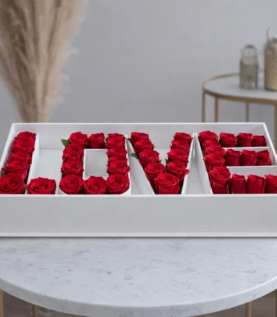 Red roses beautifully arranged to spell out “LOVE” in a clean white box. It’s a literal and stunning way to say exactly what you feel.