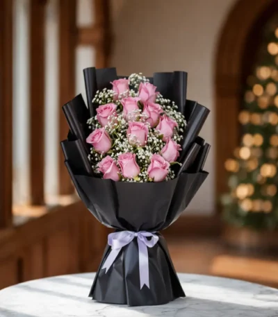 A stunning contrast of delicate pink roses nestled in a bold, multi-layered black wrap to create a look of modern elegance. This bouquet is the perfect gift for a soulmate who balances gentleness with a strong, sophisticated spirit.