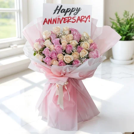 A delightful bouquet featuring 9 Pink and White Roses, beautifully complemented with 3 Red Spray Roses, delicate White Statis, and Fresh Green Fillers. Wrapped in Elegant Paper with a Happy Birthday message, this bouquet makes a perfect gift to celebrate someone’s Special Day with Love and Joy.