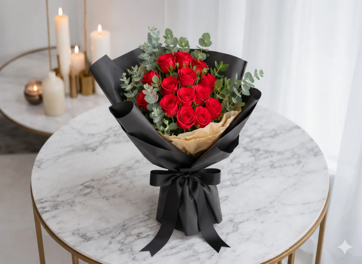 An elegant bouquet of premium red roses wrapped in sleek black packaging, designed to express deep love, passion, and timeless sophistication. Perfect for Valentine’s Day and unforgettable romantic moments. 🌹🖤