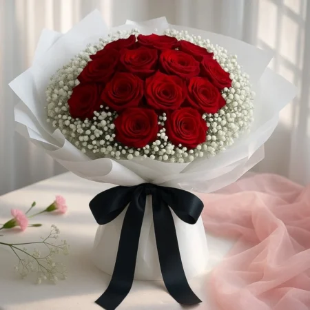 A delightful bouquet featuring 12 soft pink roses, complemented by lush green fillers and wrapped in sophisticated beige paper. Tied with an elegant brown satin ribbon, this bouquet is the perfect expression of grace and admiration, making it ideal for any special occasion