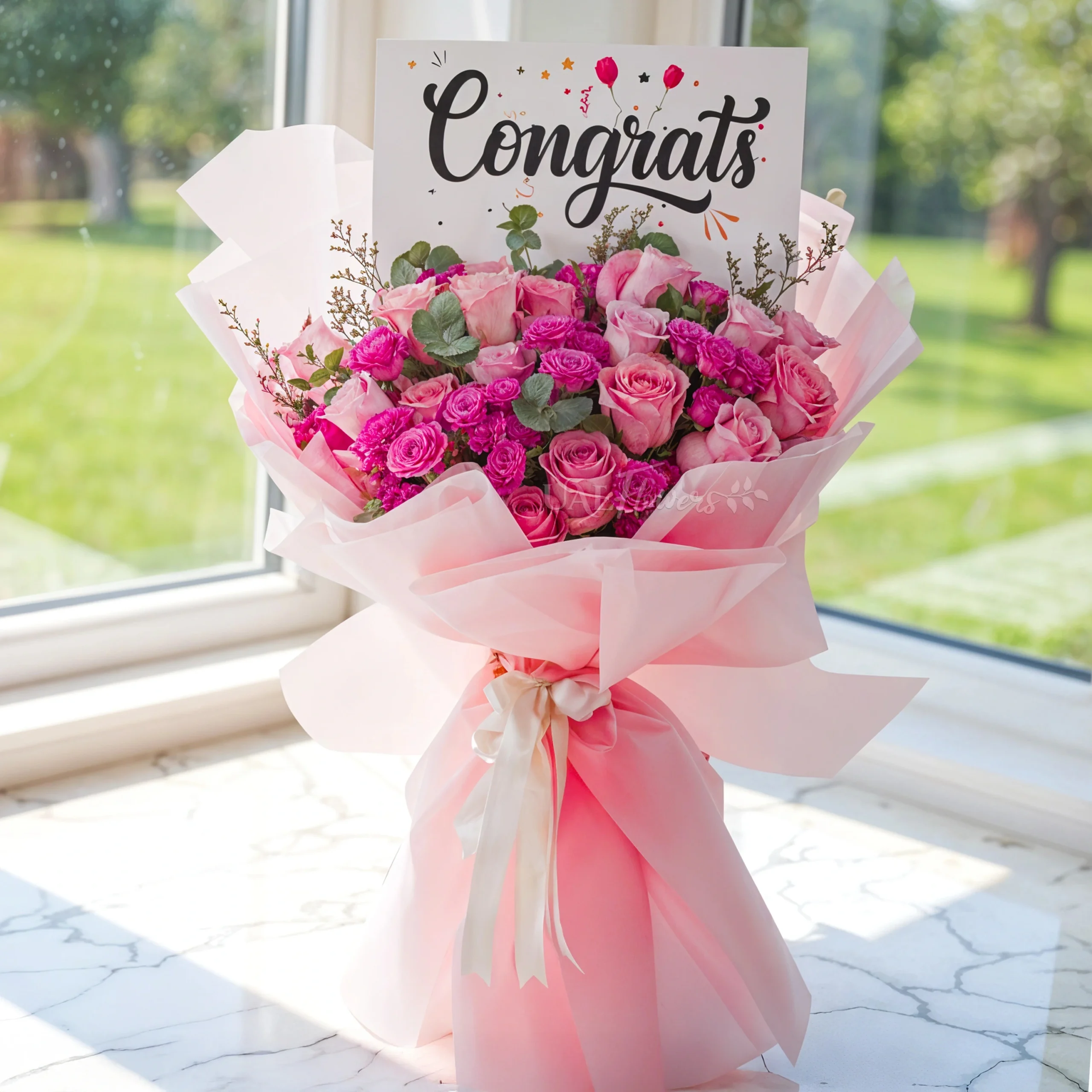A stunning bouquet featuring 9 Pink Roses and 3 Pink Spray Roses, beautifully accented with Fresh Green Fillers. Wrapped elegantly in Stylish Paper with a cheerful “Congrats” message, this bouquet is a perfect way to celebrate Special Moments and share in someone’s Happiness.