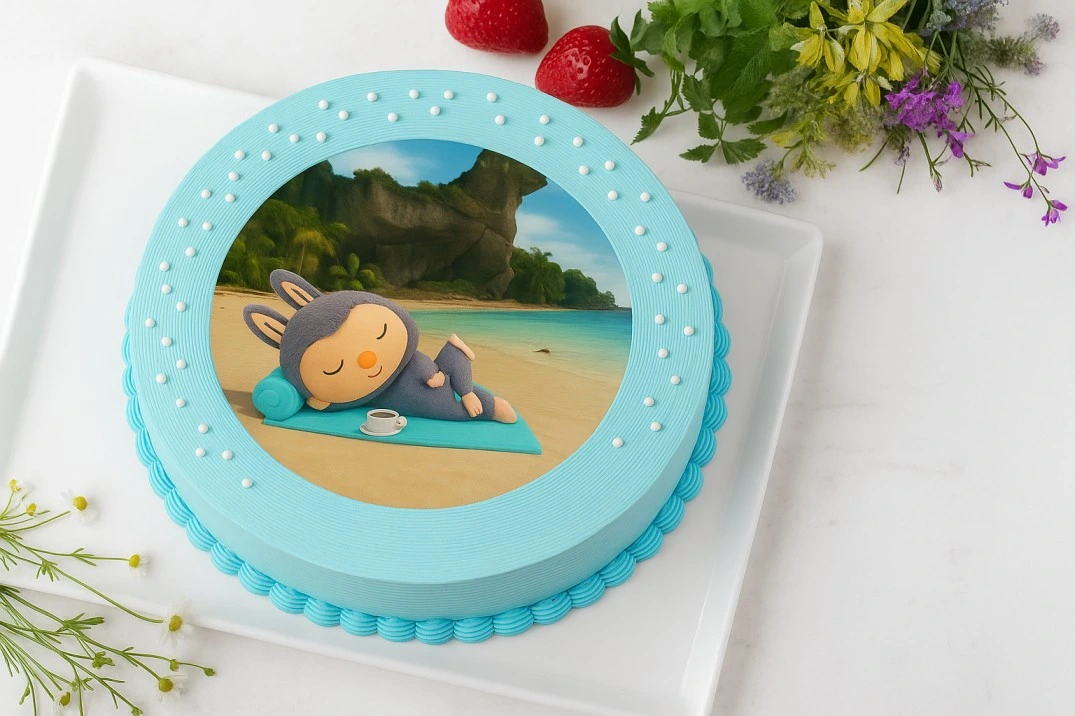 This delightful photo cake captures a moment of fun with Labubu on the beach, beautifully presented on a smooth white cake with intricate frosting borders