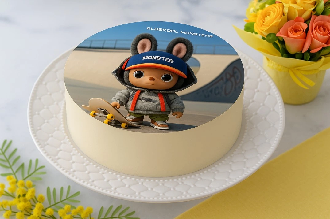 An Oldskool Monsters photo cake featuring Labubu on a skateboard, presented on a smooth, understated frosting