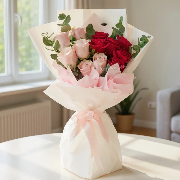 This charming bouquet of 6 red and 6 pink roses, accented with lush green fillers, is a graceful expression of love and admiration. Elegantly wrapped in soft paper packing and tied with delicate pink ribbons, it’s a thoughtful gift for romantic gestures, heartfelt surprises, or special celebrations.