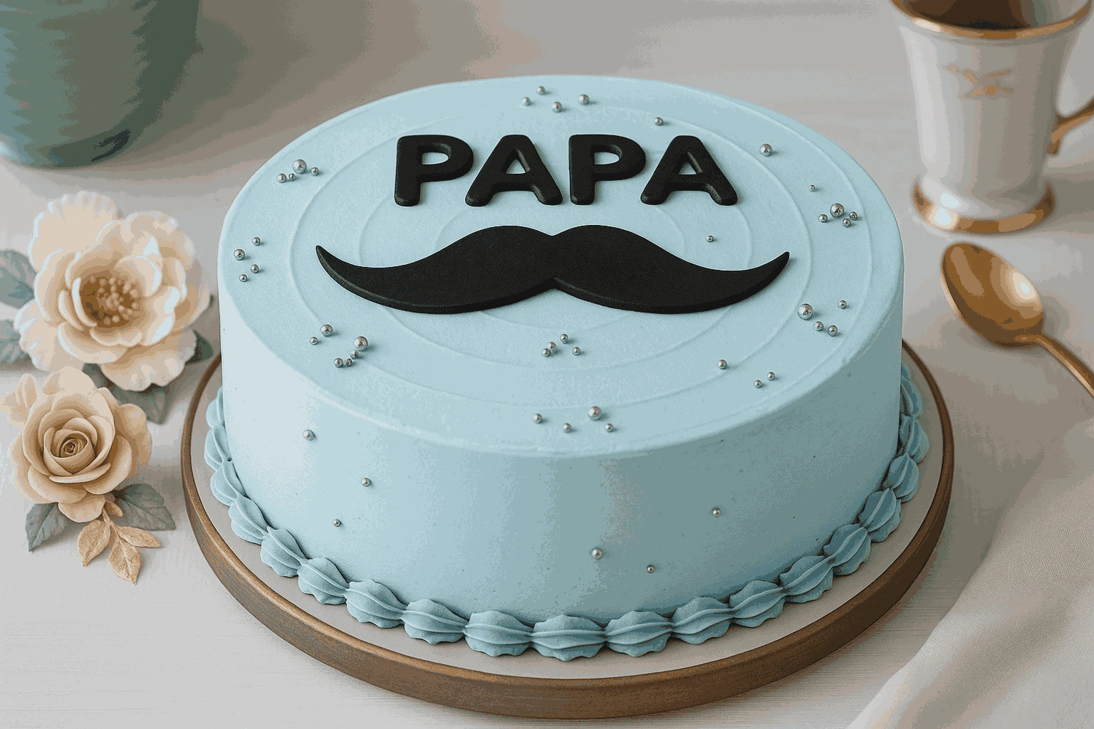 A light blue cake elegantly decorated with a classic black moustache and bold “PAPA” lettering, perfect for a distinguished dad