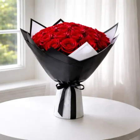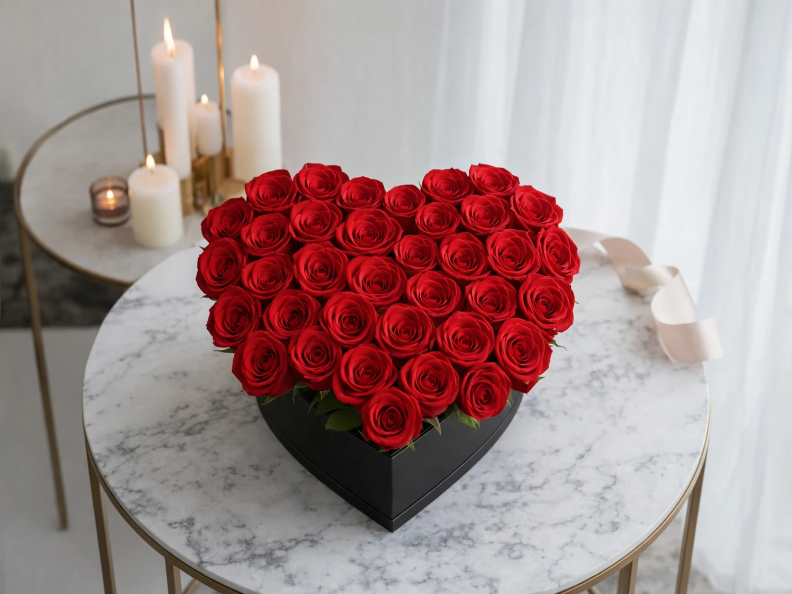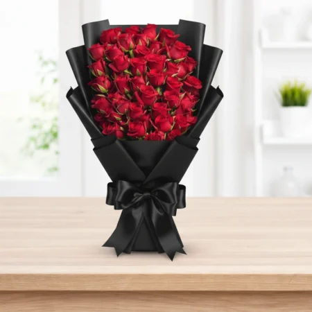 A luxurious black heart-shaped box overflowing with velvet red roses. This premium arrangement is for those who want to make a grand, unforgettable