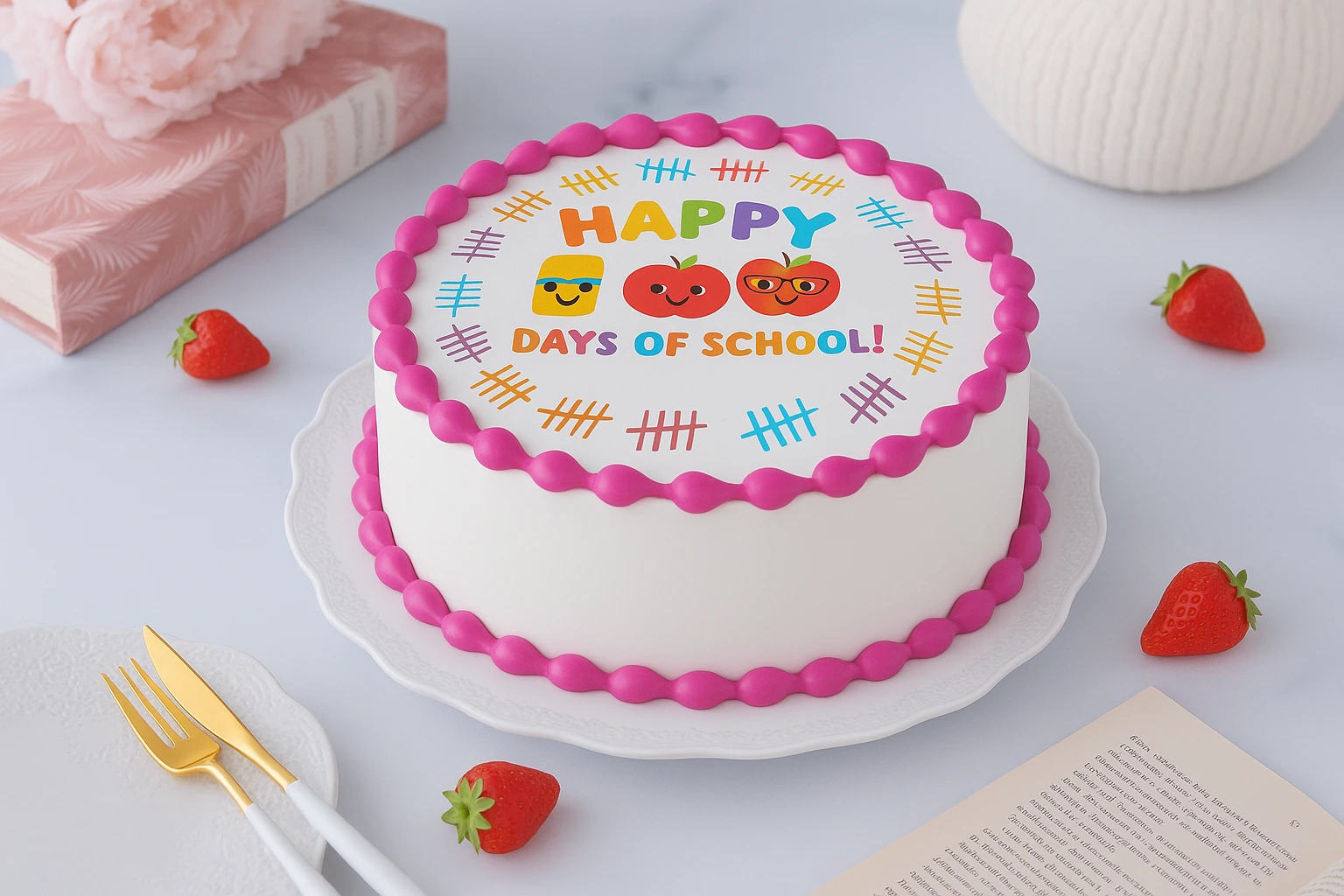 Extra special with this festive photo cake! Decorated with tally marks, apples, and a pencil eraser, it’s a fun and tasty way to mark the achievement