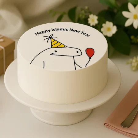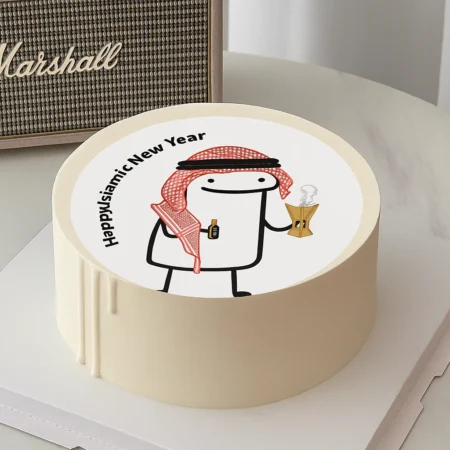 A white round photo cake with “ISLAMIC NEW YEAR” text and a simple line drawing of a person in a hijab waving, bordered by a red beaded design